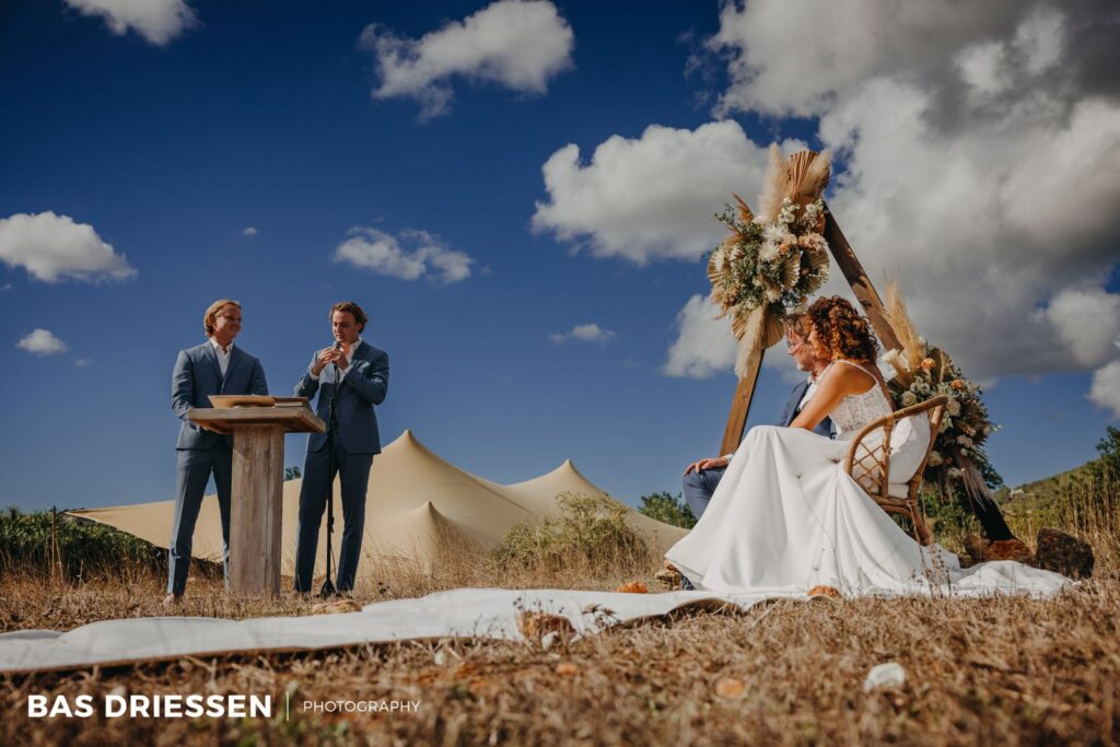 Ik arriveerde op de trouwlocatie en was direct onder de indruk van de mooie plek. Het was prachtig weer, wat een geluk. Terwijl iedereen zich klaarmaakte voor het moment suprême deed ik mijn gebruikelijke rondje langs de velden. Ik spreek alle betrokken leveranciers, van locatiemanager, tot DJ, tot fotograaf etc. Timo Kerkhof was de weddingplanner/event manager, Bas Driessen was de fotograaf. Heerlijk samenwerken met beide! Alles stond klaar. Het feest kon beginnen.